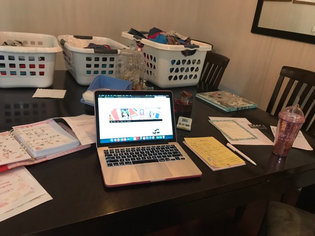 This was my day today – after two crazy weeks of craft expos and the CTMH Convention my craft room/office looked liked a bomb exploded. So to not let myself get distracted by the desire to clean up the mess I moved out to the dinning table and got to stare at baskets of folded washing (that my wonderful husband had folded this morning before going to work) that are awaiting my children to put them away after school tonight.