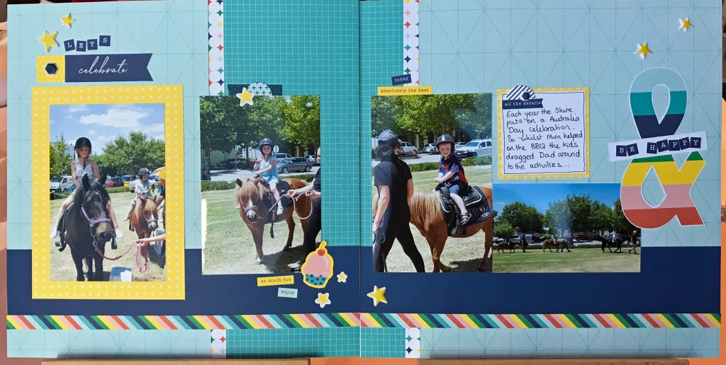 These are the three layouts from the kit instructions, populated with photos of my beautiful children (taken in February – doing well almost up to date with my 2019 scrapbooking…. hehehe).