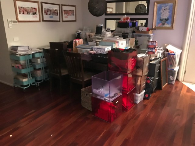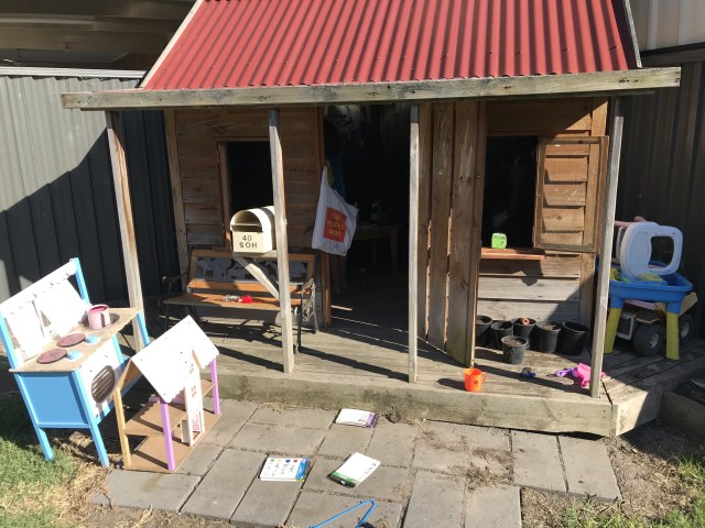 The biggest decision I made was to not put anything back in before I at least looked through it and sorted it to some degree. I half filled the rubbish bin (in my shire in Australia these are a 80L wheelie bin) with non recyclable items. These items were also not suitable to donation or sale to others. I also 2/3 filled the 120L recycle bin. Mainly with old paperwork and things that I’d been saving for goodness knows what purpose. I have a new stash of stuff to sell at my next garage sale event. My children of course got a stash of stuff to add to their own craft room. Their craft room is the old cubby house that one weekend we turned it into their craft room. My daughter took great pleasure in painting the walls – Jackson Pollock has a rival I think. You can see the video of her creation here. Below are a few of the before photos.