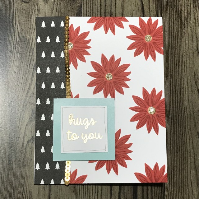 This card uses the flower stamped in Candy Apple Exclusive Ink directly onto the card base, random stamping style, with the line detail stamped in Ruby Exclusive Ink. The centre of the flowers is a gold glitter gem. The sentiment stamp I cut in half to place it on the block like this and then stamped it in Versa Mark Ink, embossed in gold embossing powder. The blue square and the black tree pattern paper have come from the new X9009 Mix In Paper packet. And it is trimmed with gold sequin ribbon.