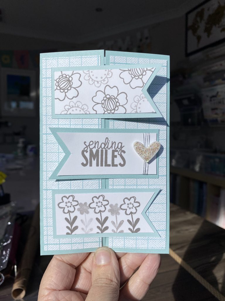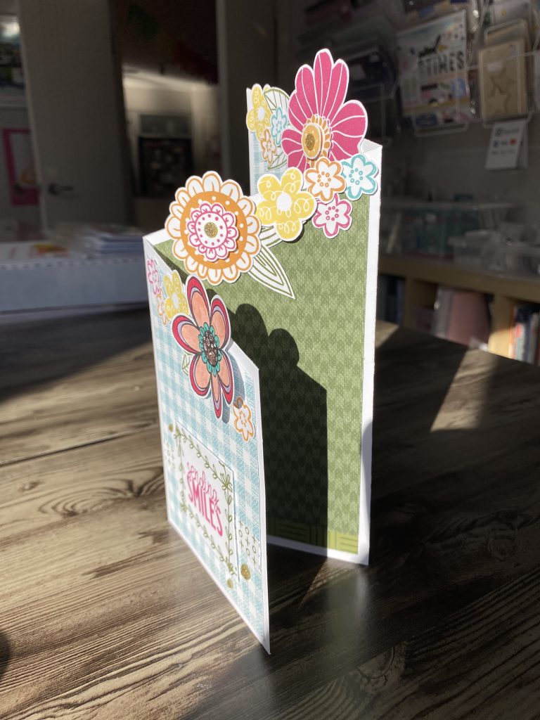This happy Tri-fold Card uses the X9017 Mix In Paper Packet combined with the stamp set stamped in a variety of the CTMH Exclusive Ink Colours – Raspberry, Tangerine, Canary, Lagoon and Fern. Plus I’ve added some gold glitter gems. A couple of flowers I stamped in Intense Black and then coloured using the Tri-blend Markers.