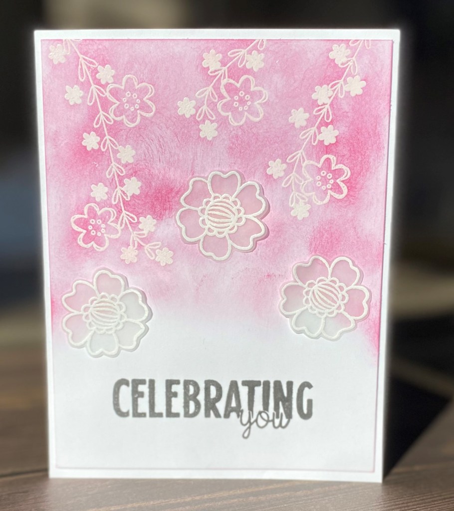 This last card was created by heat embossing on the background cardstock – I layered the embossing. Doing the vines first, then the larger flowers and lastly the small flowers. I then sponged ink over the top. The three largest flowers where embossed onto Vellum and fussy cut before sticking down with a glue dot. The sentiment is in Charcoal Ink.