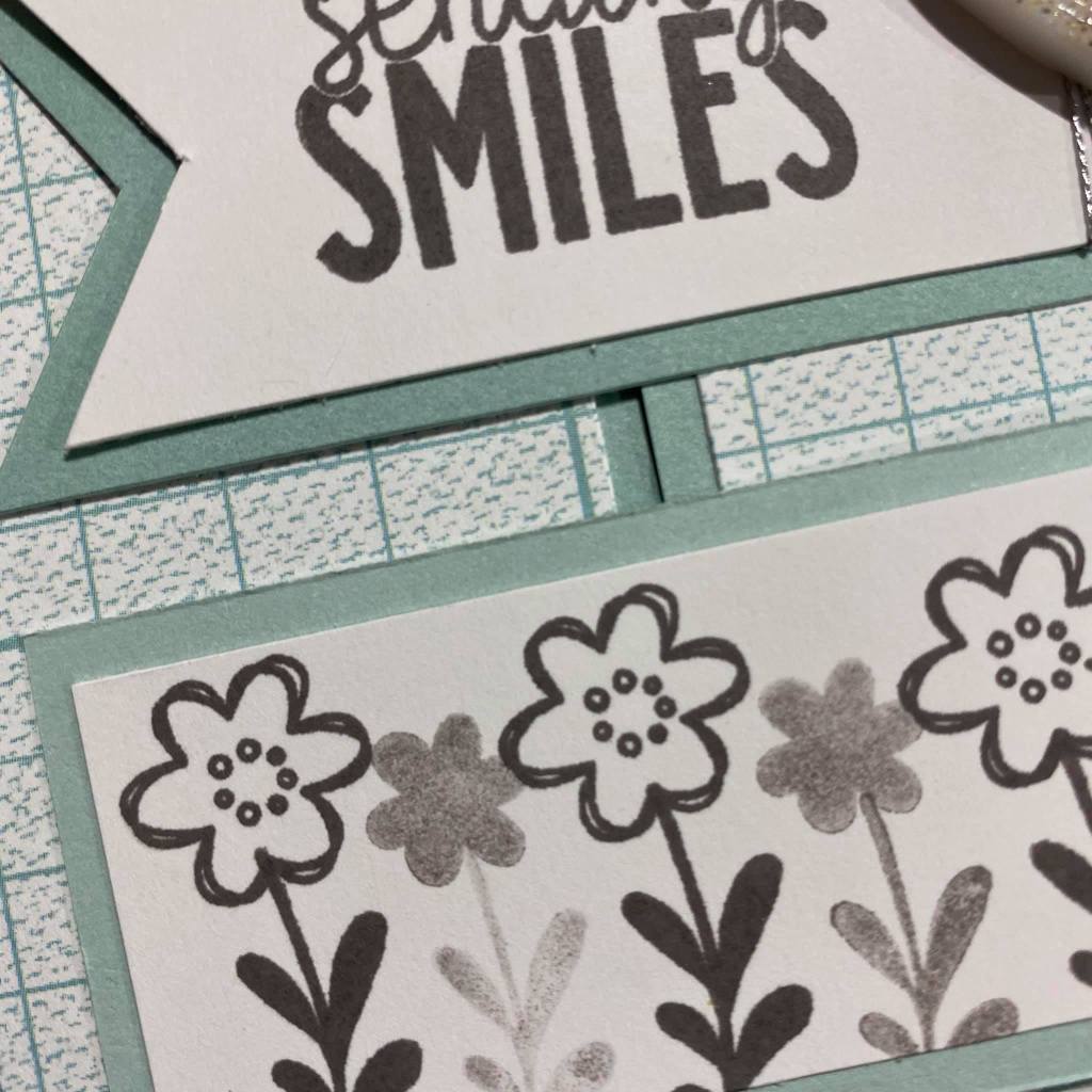 This centre opening card uses Charcoal Ink in a combination of first and second generation stamping. I’ve added some silver embellishing thread and an acrylic white heart that is then covered in Stickles for extra sparkle.