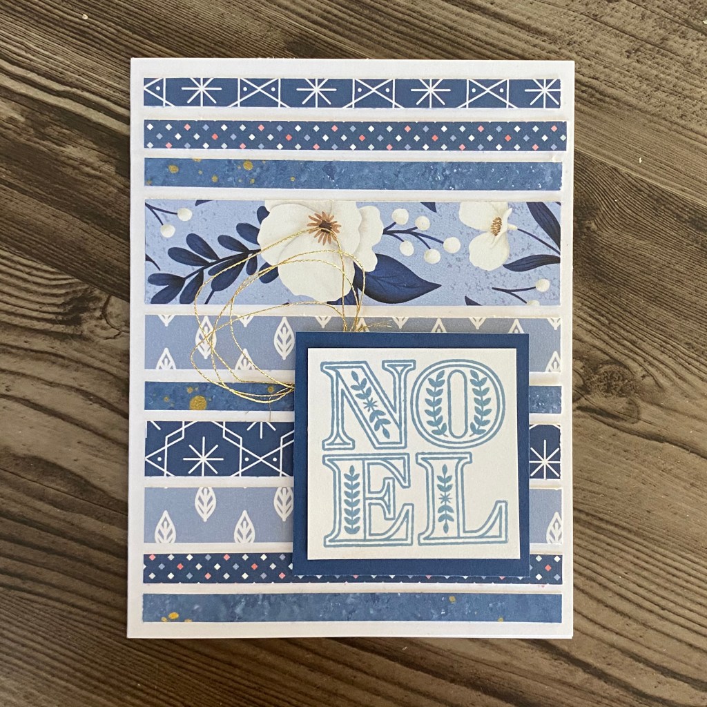 Today I would like to share with you a creation which features Close To My Heart Featured collection “Serenity ”. It’s a quick card, using up bits and pieces from the Serenity Paper pack and also the Current Mix In Paper Pack. Plus the Noel stamp in Blue Belle Ink. Plus the addition of some gold embellishing thread.