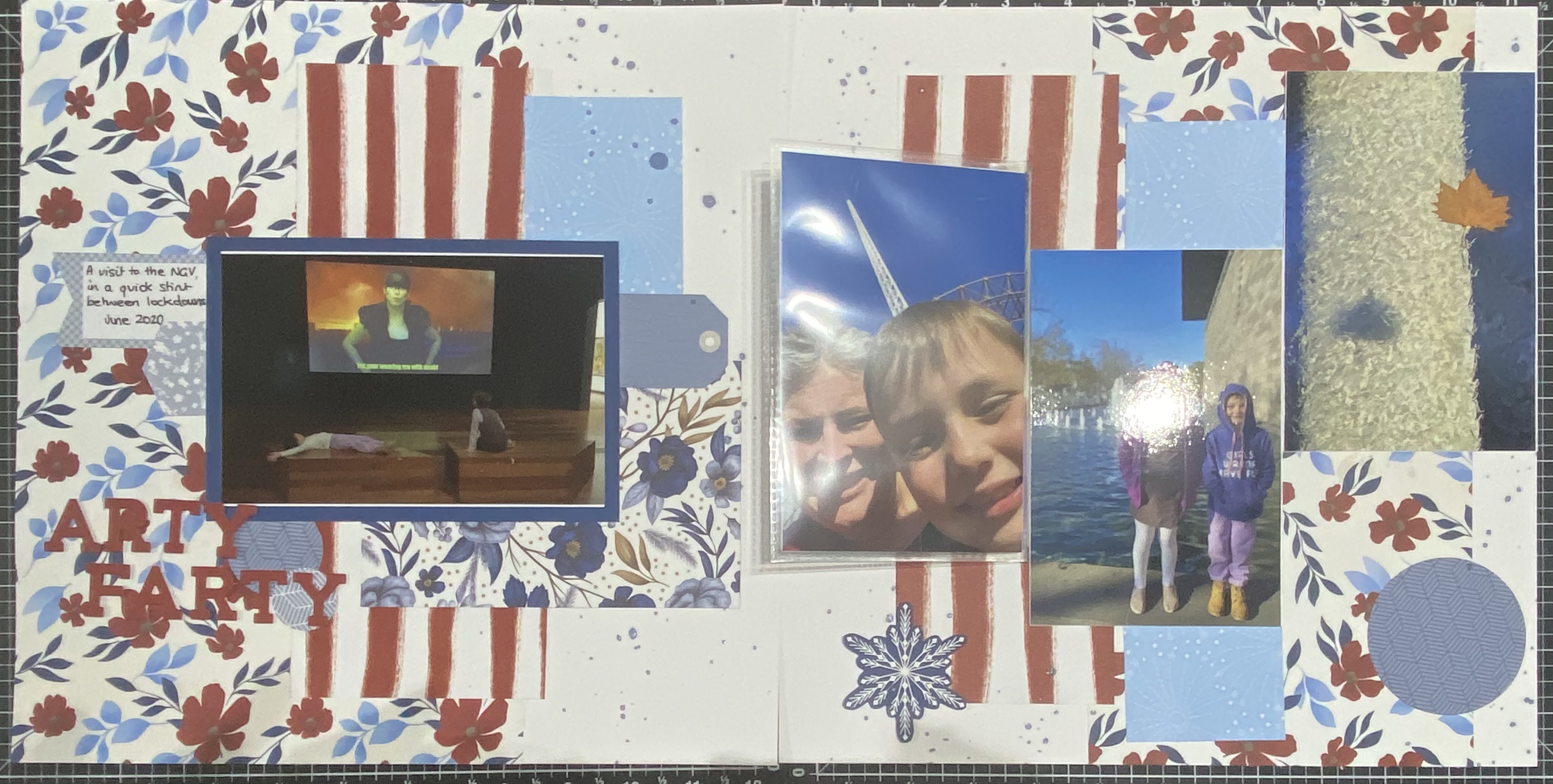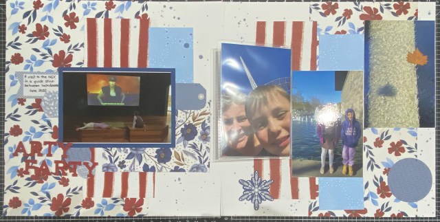 Today I would like to share with you a creation which features Close To My Heart Featured collection “Stars and Sparklers”. The thing I Iove about these papers is that whilst it has a leaning toward the USA 4th of July it is still very usable for other things. This first creation is a visit to an art gallery in winter last year. I’ve also snuck in an odd piece of Serenity from my stash (the blue flowered piece). And I splattered Blue Belle Shimmer Brush on the page (as an afterthought.