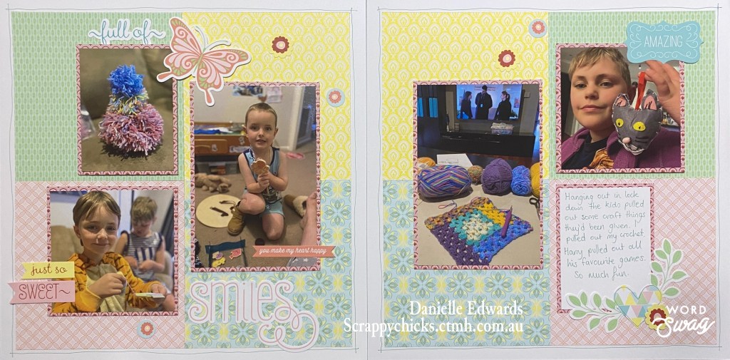I was inspired by the photo that has my crochet square, so I decided to do a bit of a square “patchwork” int he background. Then I used the rather bold pattern that has the red on the pink (it was a bit hard on my eyes in large doses, but I love it) as photo mats. I also used a Jade Green LePen to add a doodle boarder and in the journaling. I added some stickers. The title “full of smiles” was a larger sticker – so I cut it in half to spread it across the page.