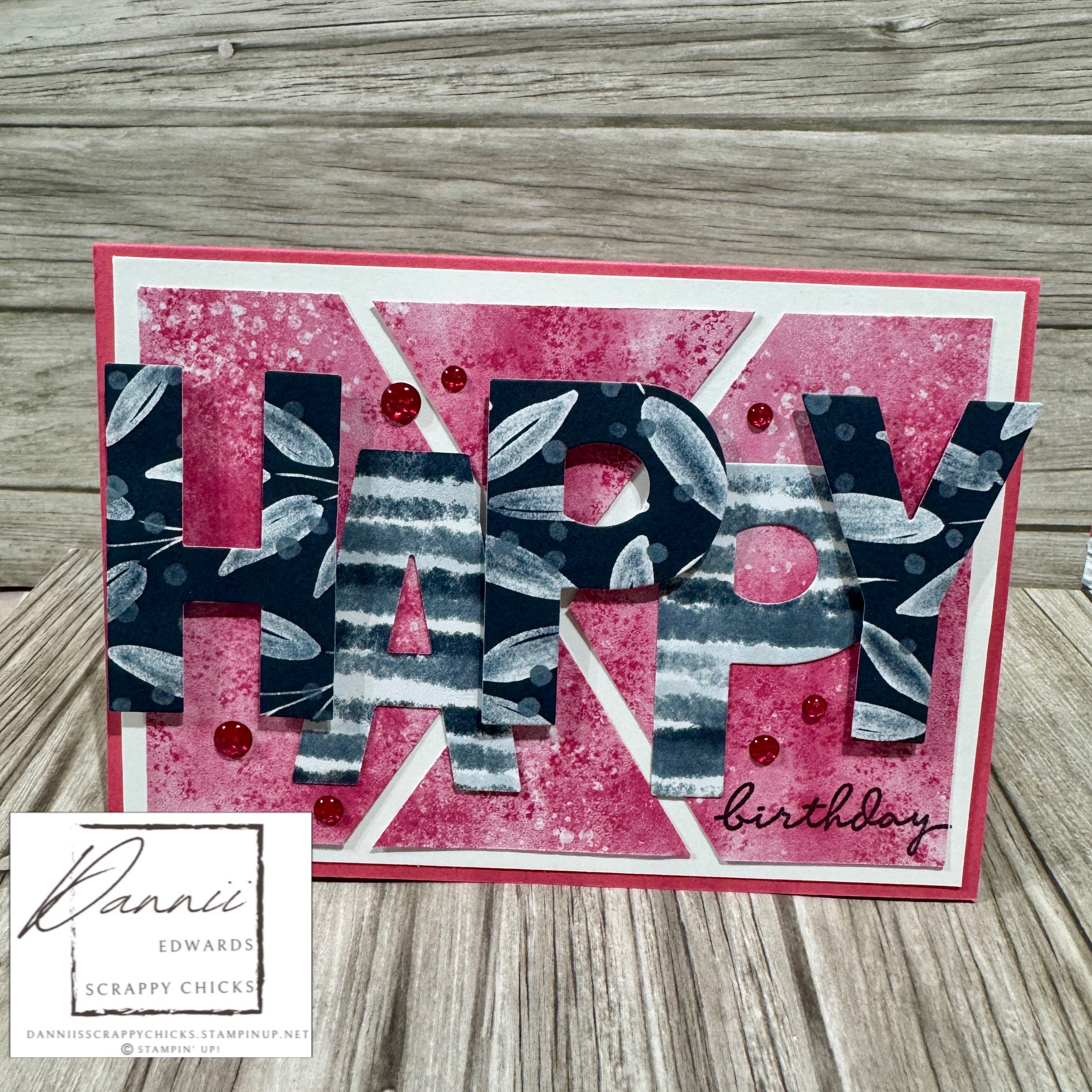 To make this car I used some of the 2025-2027 In Color Designer Series Paper, some basic white and Strawberry Slush cardstock, Pretty in Pink Gems and the feature the Party Alphabet Dies. You can view the products on my website here. The pattern paper piece I cut on the diagonal twice and then just seperated the pieces to show the cardstock behind. And added a stamp from my stash.