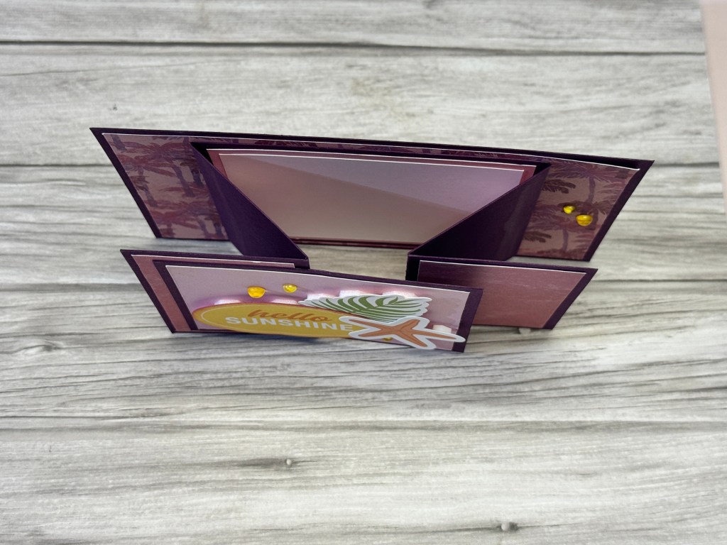 This is such a fun interactive fancy fold card. I decided to use the Beach Boardwalk Designer Series Papers again, this time with the sticker pack (#166840), and some Blackberry Bliss Cardstock. Around the edges of the title sticker I added some Blackberry Bliss ink to the edges. In the picture below you can see the the interactive front is from one main piece that is folded and attached to the backing piece. And a small centre panel is added for the sentiment and embellishments. When the front of the card is opened you can write on the inside.