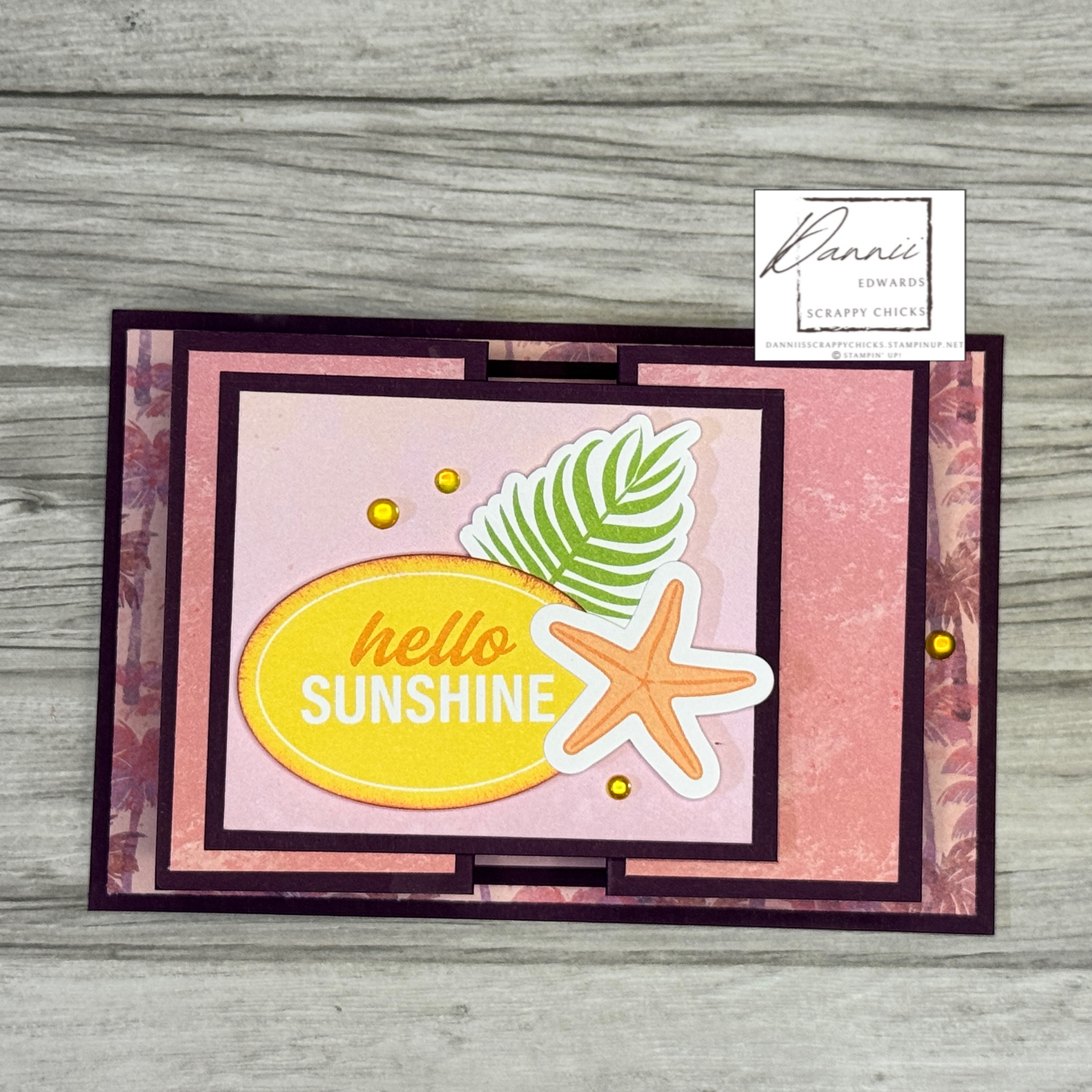 This is such a fun interactive fancy fold card. I decided to use the Beach Boardwalk Designer Series Papers again, this time with the sticker pack (#166840), and some Blackberry Bliss Cardstock. Around the edges of the title sticker I added some Blackberry Bliss ink to the edges. In the picture below you can see the the interactive front is from one main piece that is folded and attached to the backing piece. And a small centre panel is added for the sentiment and embellishments. When the front of the card is opened you can write on the inside.
