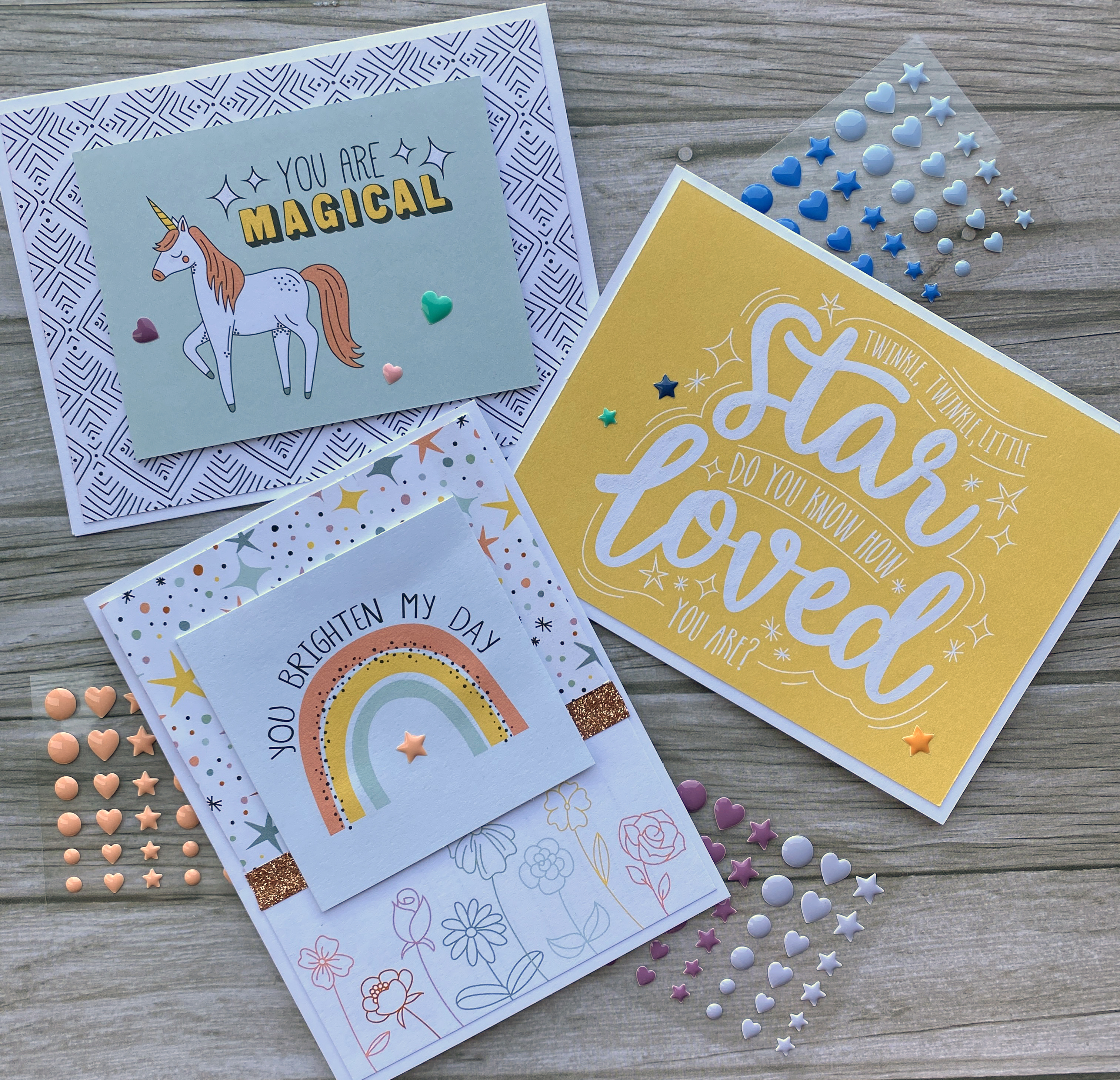 The April Stamp of the Month (S2304) – Sweet Tweets is a cutie. The birds and darling sentiments really do lend themselves to cards. And I’ve seen some beautiful examples from my crafty friends that have some beautiful colouring of the birds, however I feel that in this instance leaving them black and white makes them pop off the colours in the background papers. The background glacier print paper and the strip of arrows are from my stash of treasures. The wood grain and hesian look paper is one of the new double sided papers from the April-June Mix in Paper collection X9048. This paper has some great neutral pattern and texture papers that compliment not only the papers in the April-June Seasonal Expression Catalogue, but many other papers in our previous ranges. The stars and hearts are from a packet of enamel dots that I the coloured with Metallic Paint Markers.