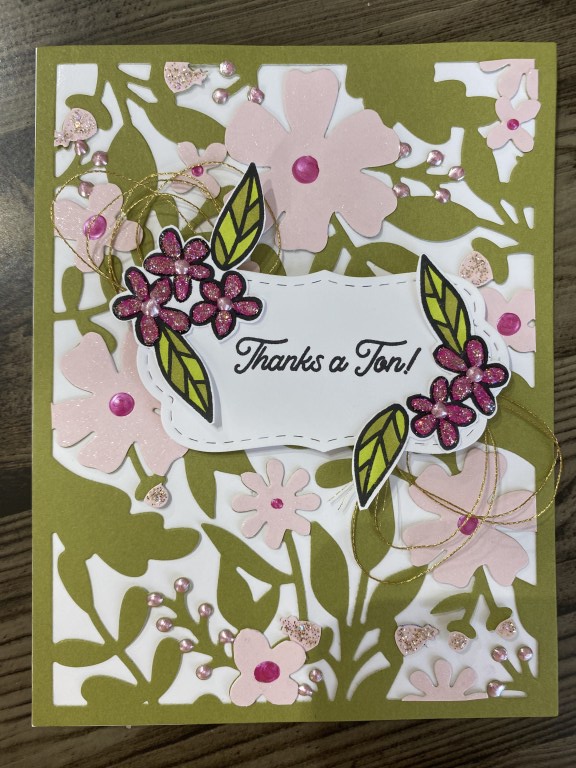 This time using the Floral Background die and the Stitched Scalloped Brackets. Combined with some fussy cut flowers from the stamp set. I’ve also added stickles and liquid pearls and gold embellishing thread.