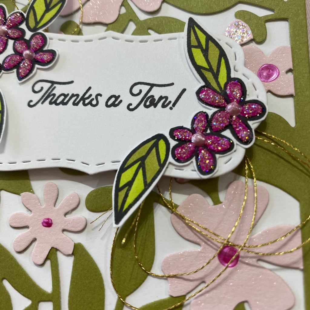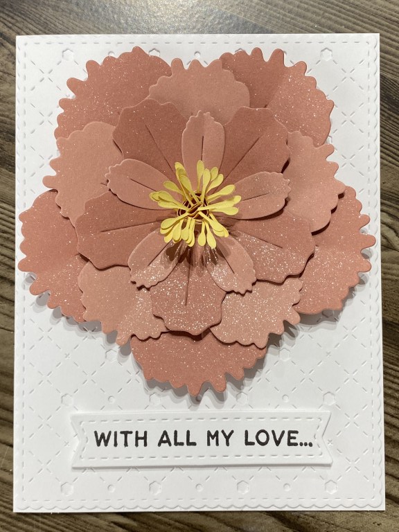 Using the new 3D Flower Dies, the banner is from the Waterfall Die set and the background is the Stitched Lattice Background Die. Of course I’ve added lots of shimmer brush too.