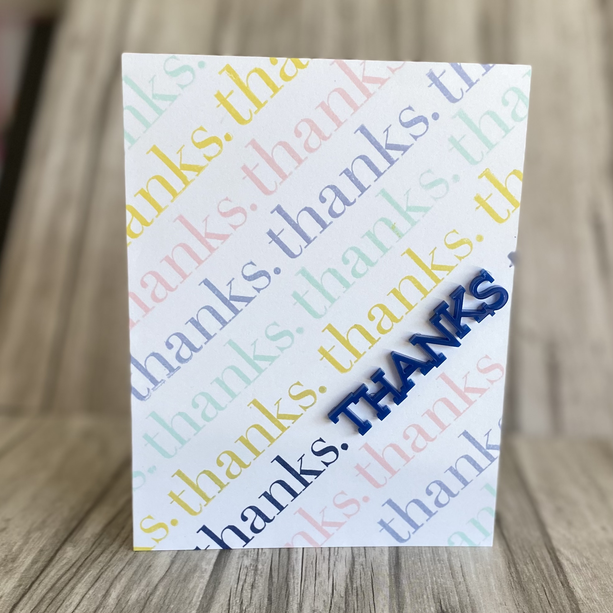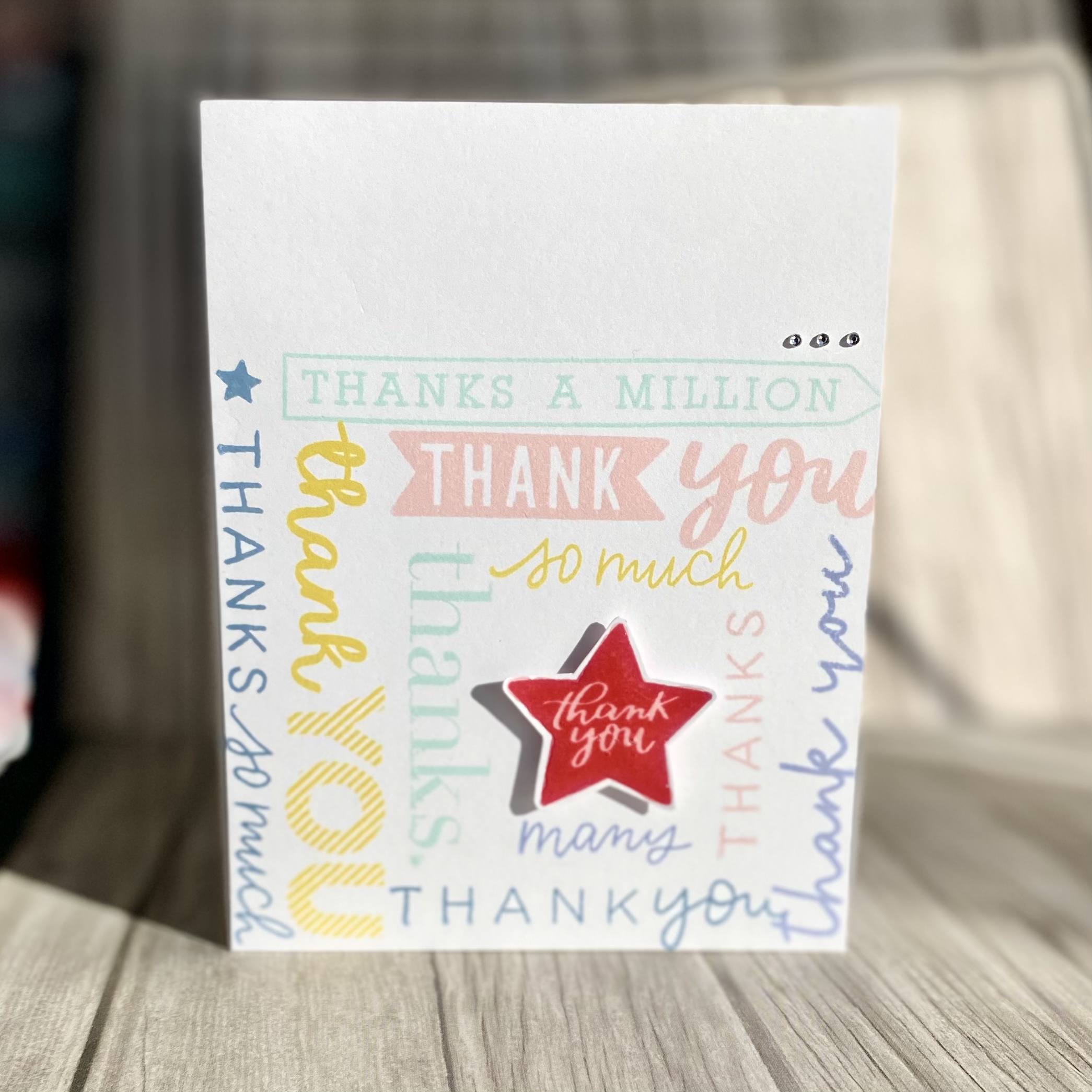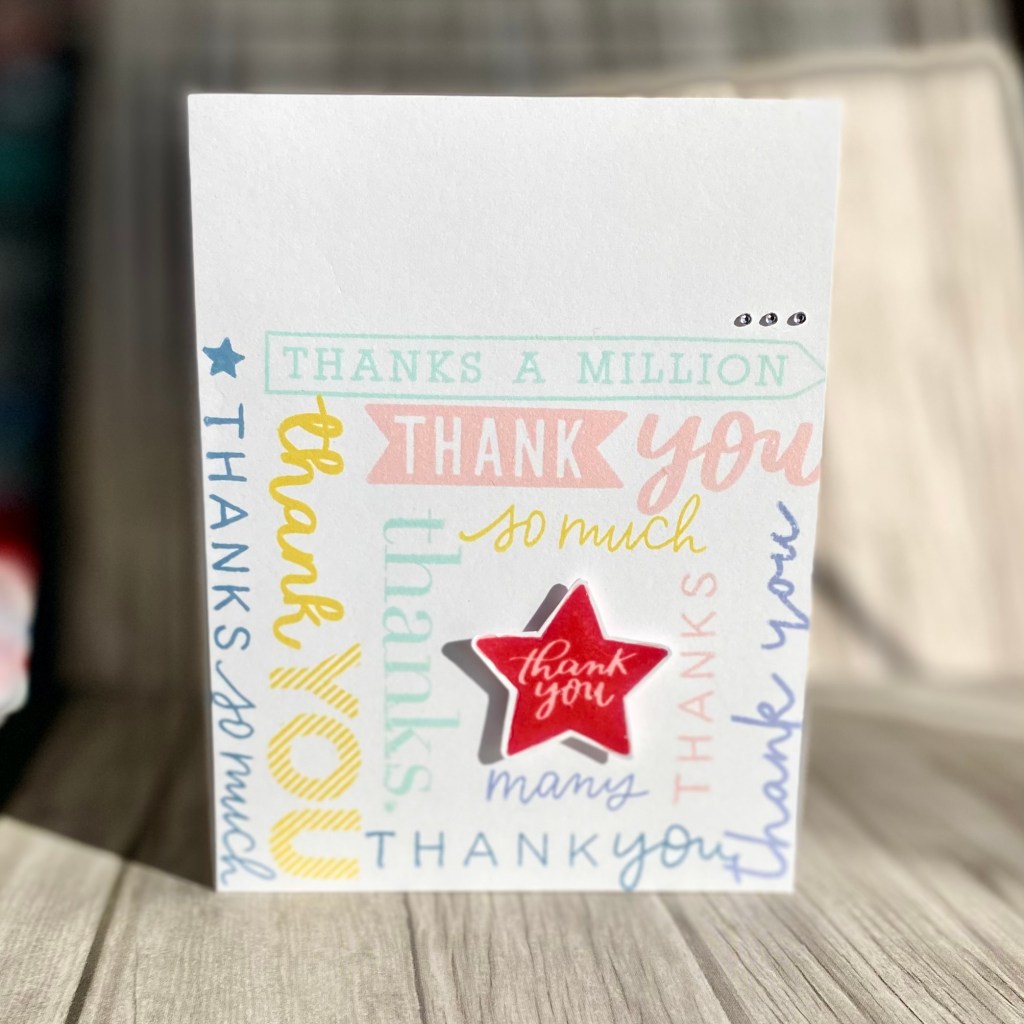 This last card uses the same colours, except I’ve added Blue Belle, and swapped the Sapphire for Raspberry. On top of the raspberry star shaped “thank you” I’ve added liquid glass for some extra dimension. I love the look liquid glass adds to things.