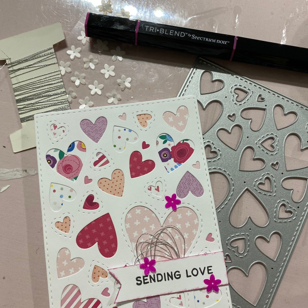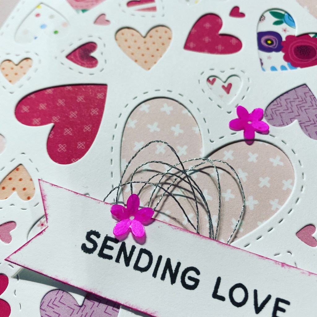 Using the Heart Background die and some paper scraps, combined with silver embellishing thread and some of the white flower sequins that I coloured with a pink tri-blend marker.